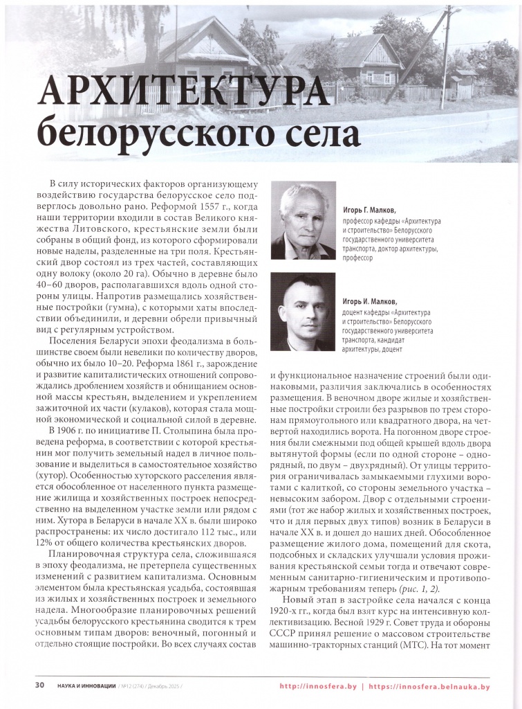 1. Малков, И. Г., Малков, И. И. Архитектура белорусского села / Игорь Г. Малков, Игорь И. Малков // Наука и инновации. – 2025. – № 12. – С. 30–35. (Исследования)