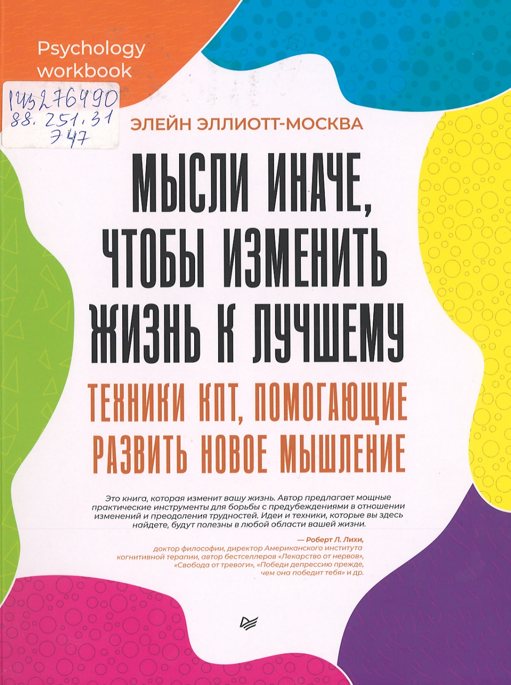 Эллиотт-Москва, Э. Мысли иначе, чтобы изменить жизнь к лучшему : техники КПТ, помогающие развить новое мышление / Элейн Эллиотт-Москва ; [перевела с английского О. Шилова] ; Ассоциация когнитивно-поведенческой психотерапии. – Санкт-Петербург [и др.] : Питер, 2023. – 221, [2] с. – (Серия «Psychology workbook»)
