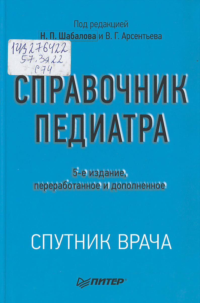 Справочник педиатра : учебное пособие / [Е. С. Анциферова и др.] ; под редакцией Н. П. Шабалова и В. Г. Арсентьева. – 5-е изд., переработанное и дополненное. – Санкт-Петербург [и др.] : Питер, 2023. – 751 с. – (Серия «Спутник врача»).